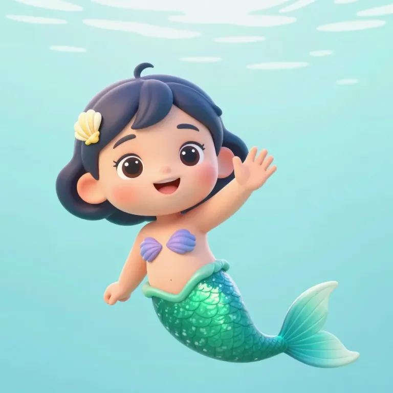 A cheerful little mermaid with glossy hair waves gently underwater, illuminated by soft, diffused light that creates gentle highlights on her scales and hair. The clear, light blue water with subtle ripples in the background emphasizes the subject and adds a serene, dreamy quality to the image.
