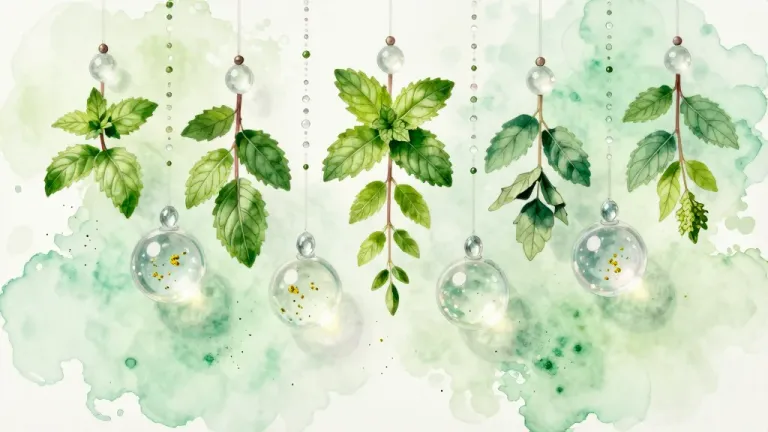 Glossy mint leaves gracefully hang from smooth orbs suspended by delicate strings, illuminated by soft, diffused light that accentuates the dewdrops and orbs. The watercolor wash background enhances the focus on the subject, creating a serene and balanced composition.