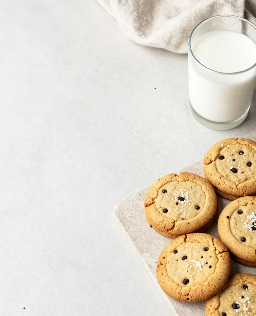 Golden brown cookies with dark chocolate chips and white sprinkles are arranged on a textured cloth, accompanied by a glass of creamy white milk. The soft, diffused lighting highlights the textures and creates gentle shadows, emphasizing the depth and composition of the scene.