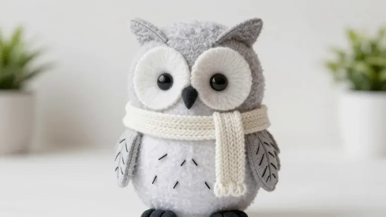 A soft, fuzzy plush owl adorned with a cream-colored knitted scarf, wrapped in a cozy indoor setting with diffused lighting and gentle shadows. The slightly blurred background with hints of greenery emphasizes the subject and creates a warm, inviting atmosphere.