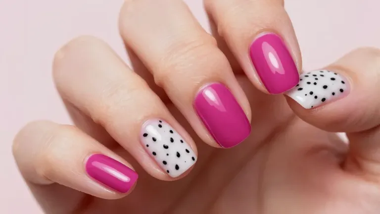 A close-up of nails painted in bright pink with a white polka dot pattern, showcasing a glossy finish and soft, diffused lighting that highlights the texture and color. The neutral beige background ensures the nails stand out prominently.