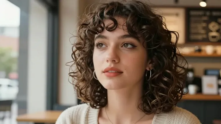 A woman with curly hair gazes off to the side, her expression contemplative, in a softly lit coffee shop setting. The shallow depth of field and warm tones create a serene and intimate atmosphere, ideal for a calm, reflective mood.