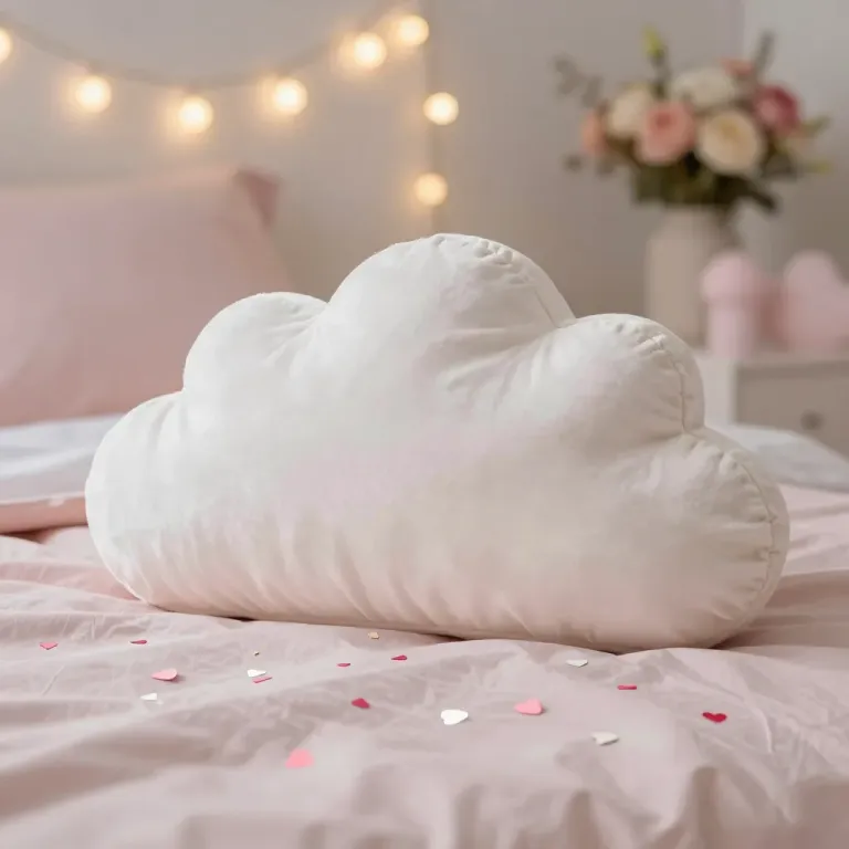A plush, velvety cloud-shaped pillow rests on a soft pink bedspread, illuminated by warm string lights that cast a dreamy ambiance. The shallow depth of field and centered composition create a serene and inviting atmosphere.