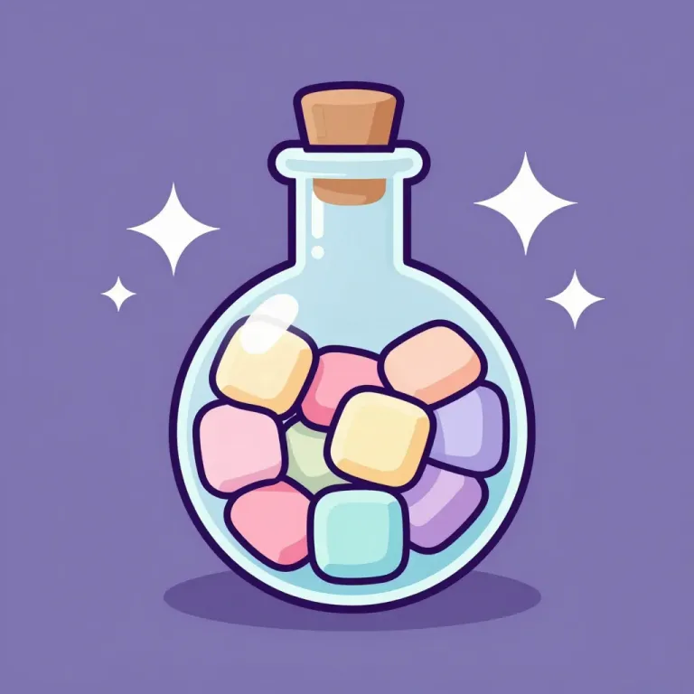 A soft, ethereal glow emanates from a potion bottle filled with glossy, pastel-colored candies, creating a magical and enchanting atmosphere. The composition is centered, with the candies filling the lower half of the bottle, and the light purple background with subtle sparkles enhances the whimsical and fantastical feel.