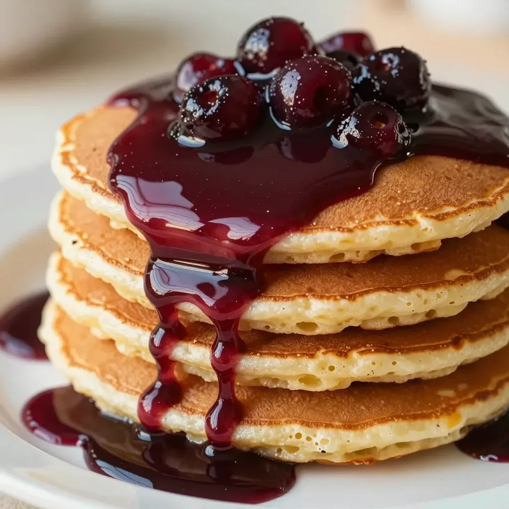Golden pancakes are artfully stacked and topped with a glossy, vibrant red berry glaze, creating a visually appealing and appetizing composition. The warm, diffused lighting highlights the glossy texture of the glaze and the golden hue of the pancakes, creating a soft, inviting atmosphere.
