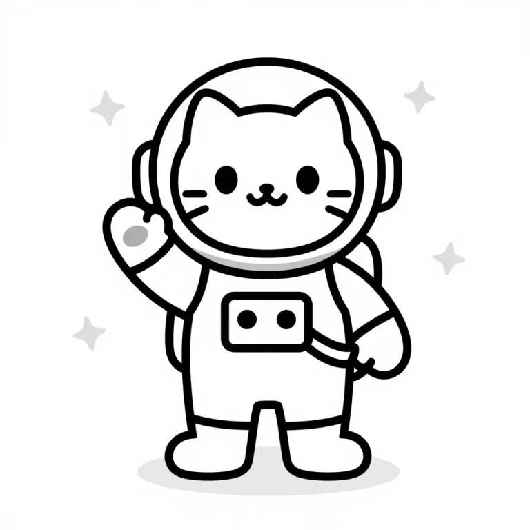 A cartoon cat in a simplified astronaut suit waves with one paw while holding a small heart-shaped object in the other, rendered in bold black outlines on white. Soft overhead lighting creates a subtle drop shadow beneath the feet, and the centered, symmetrical composition on a plain light gray background with faint star sparkles provides clean, uncluttered copy space.
