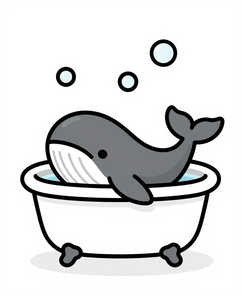 A gray cartoon whale with a white underbelly sits comfortably in a white porcelain bathtub, surrounded by light blue water and floating bubbles. The image features soft, diffused overhead lighting and a centered, symmetrical composition with a plain light gray background, providing ample copy space.