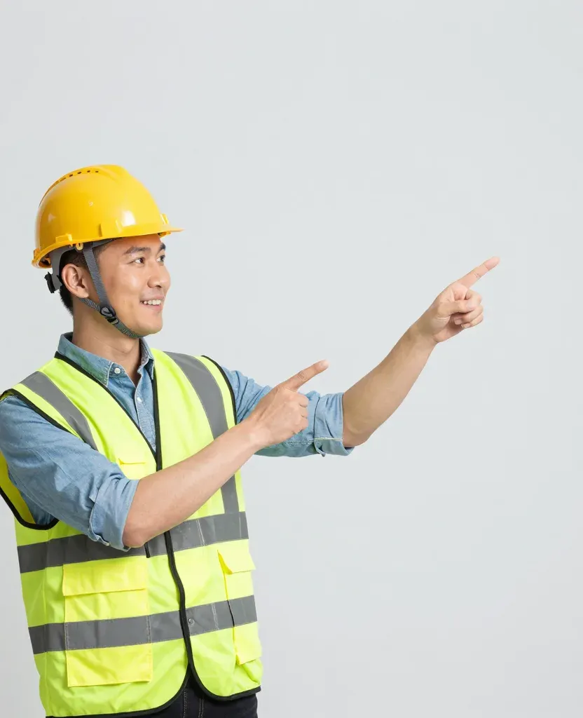 A construction worker in a yellow hardhat and high-visibility vest points to the right, with soft, even lighting highlighting the glossy hardhat and reflective vest. The plain, light gray background ensures the subject remains the focal point.