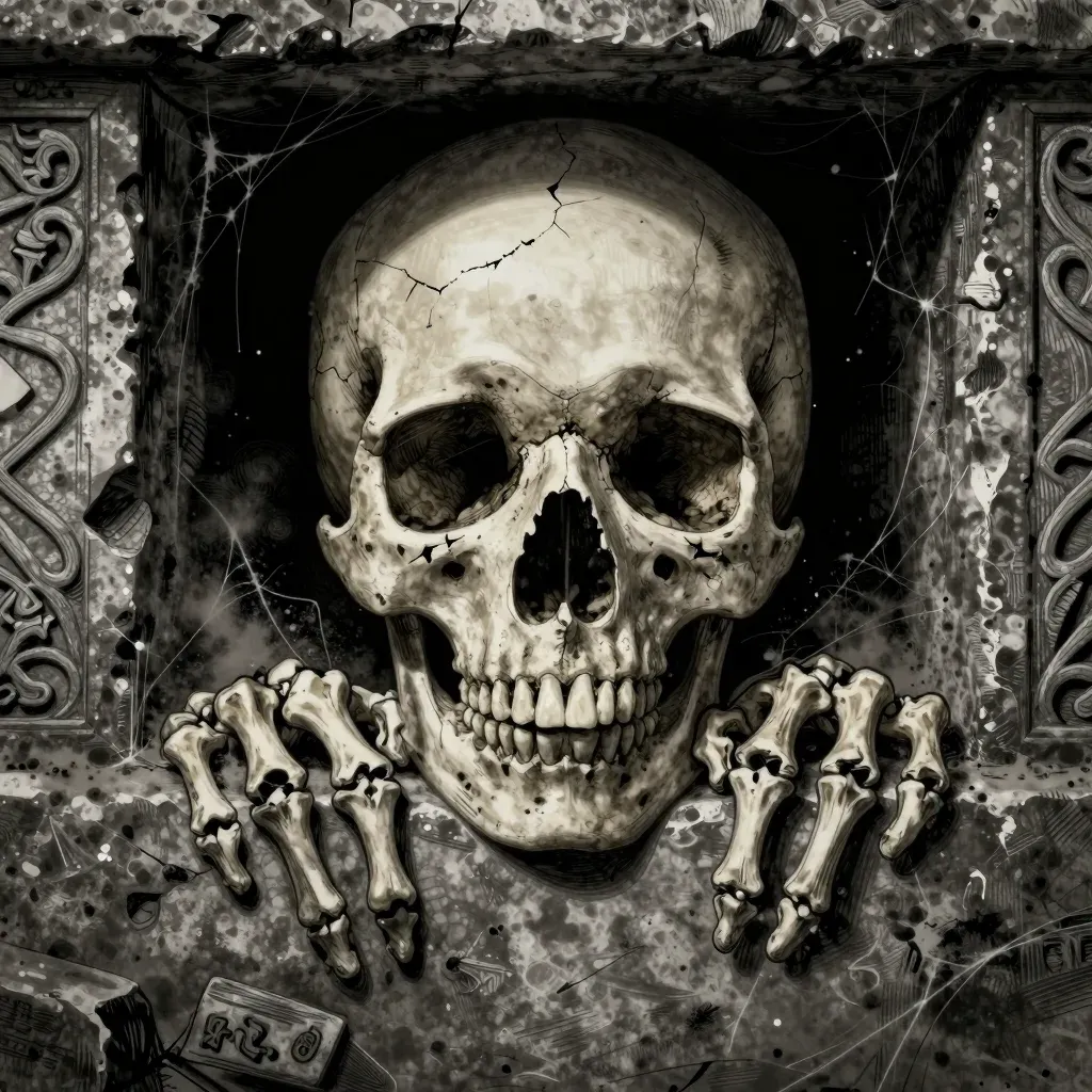 A decaying skull peers through a cracked crypt door, surrounded by cobwebs and decaying wood. The dim, moody lighting highlights the skull's surface and teeth, creating a haunting and atmospheric effect.