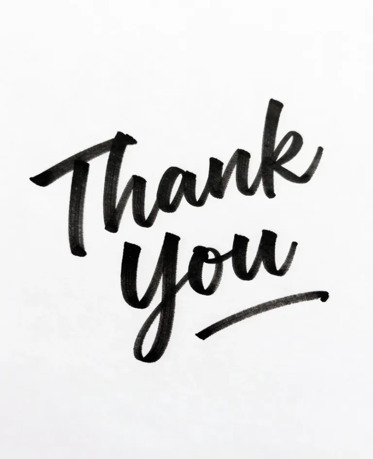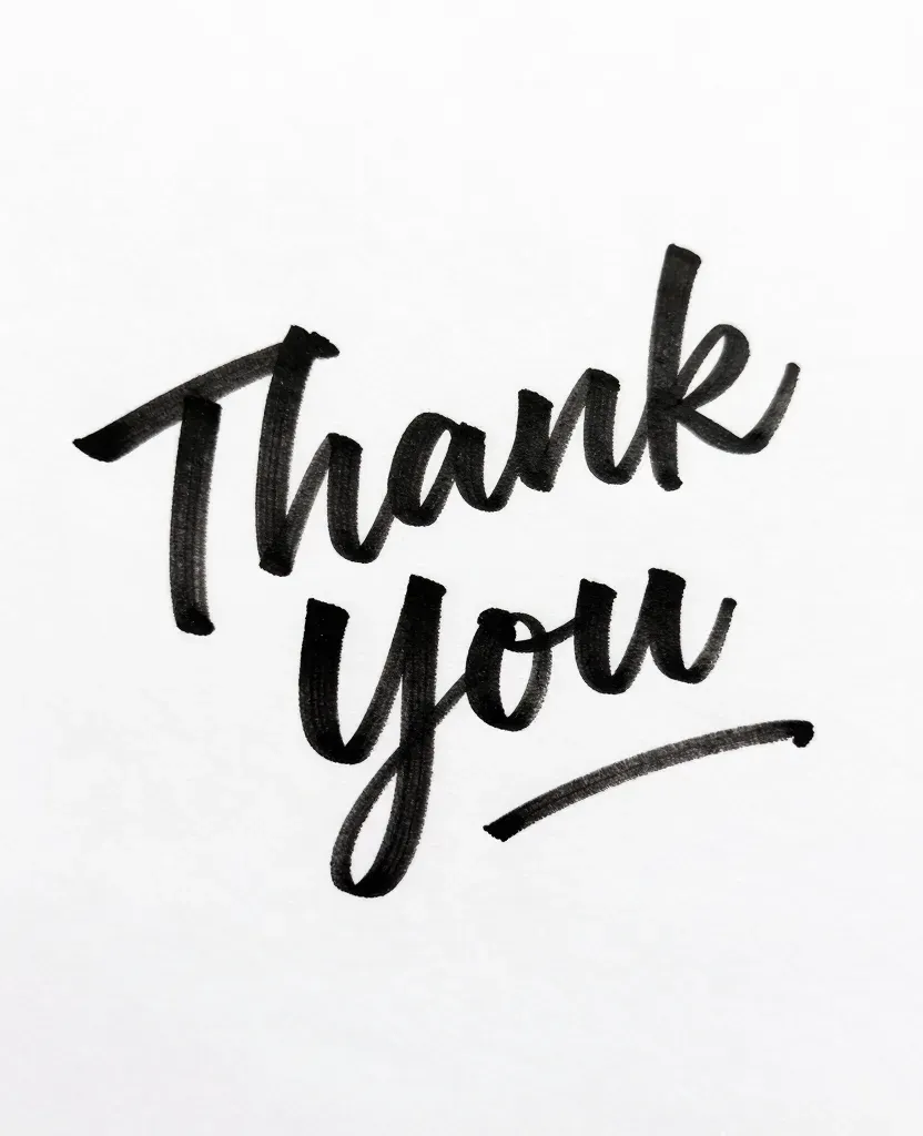 A bold, textured black ink handwritten 'Thank You' note against a pure white background. The soft, even lighting highlights the cursive script, creating a clean and minimalistic composition.