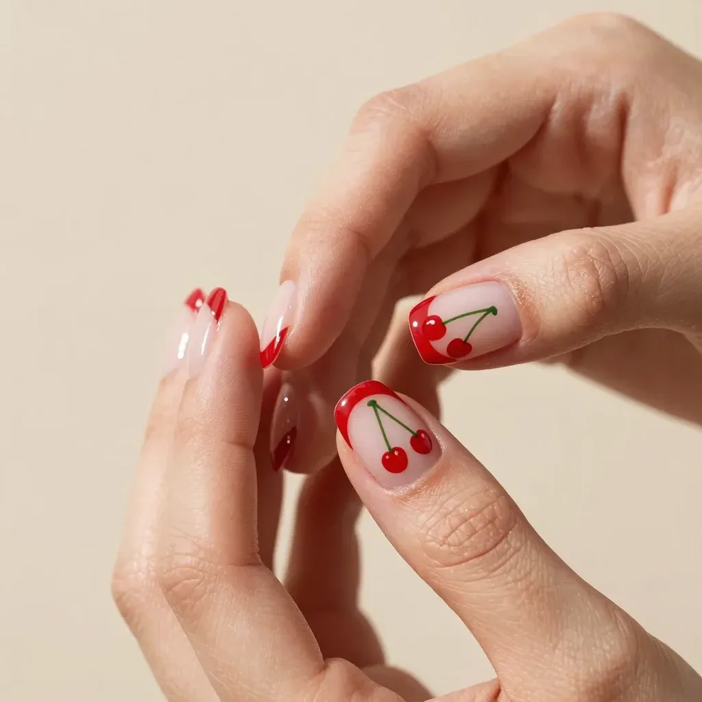 Close-up of hands with glossy French manicures featuring cherry accents, bathed in soft, diffused light that creates a warm, inviting glow. The neutral, light beige background provides a clean and unobtrusive backdrop, ideal for product or beauty shots.