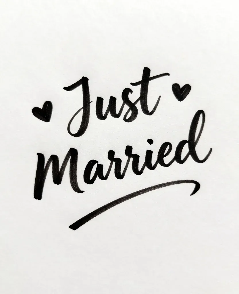 A glossy black 'Just Married' script with two hearts, set against a smooth matte white background under even, soft lighting. The clean and uncluttered composition provides ample copy space for design purposes.