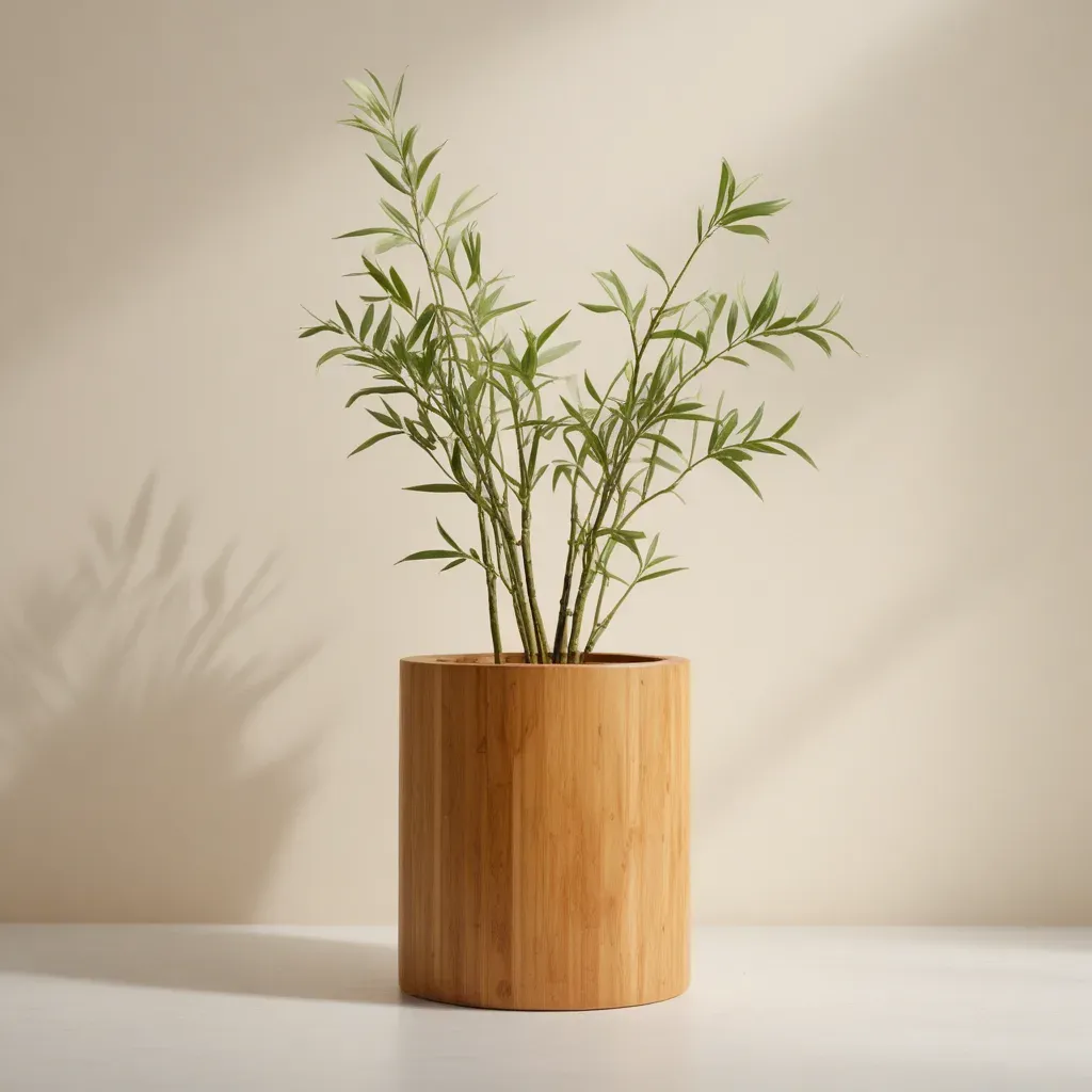 A bamboo plant with smooth, glossy leaves sits in a natural wood planter, bathed in diffused, warm light that creates soft shadows and highlights. The minimalistic beige wall background, slightly blurred to emphasize the plant, provides a clean and elegant setting.