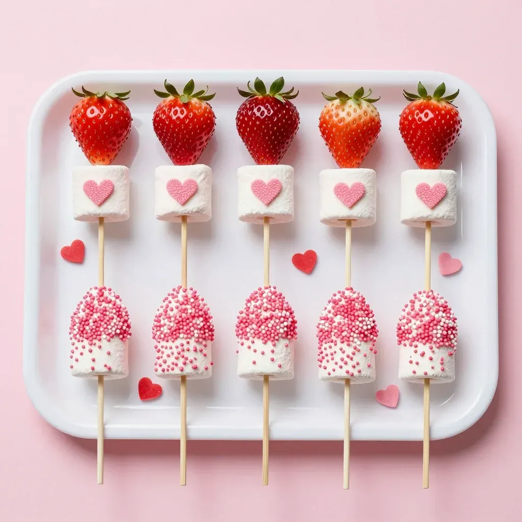 Neatly arranged skewers of glossy strawberries and fluffy marshmallows adorned with pink hearts and sprinkles, illuminated by soft, diffused light that enhances the textures and creates gentle shadows, set against a solid pink background that complements the colors of the treats, creating a clean and visually appealing composition.