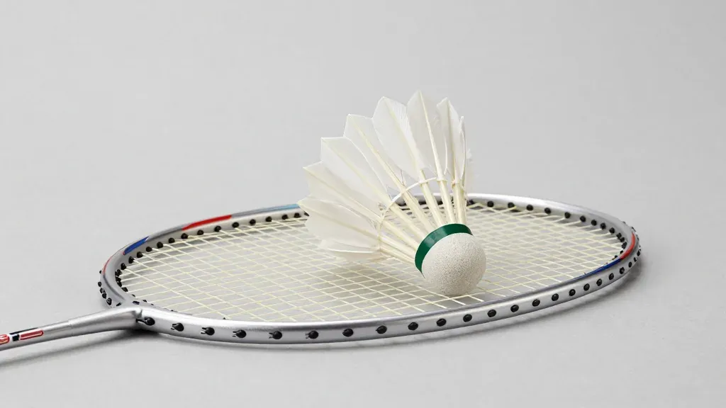A white shuttlecock with translucent, ruffled feathers and a smooth cork base rests atop the taut nylon strings of a polished metal racket, illuminated by soft directional light from the upper left. The shallow depth of field and neutral grey background emphasize the subject, providing clean copy space on the right.