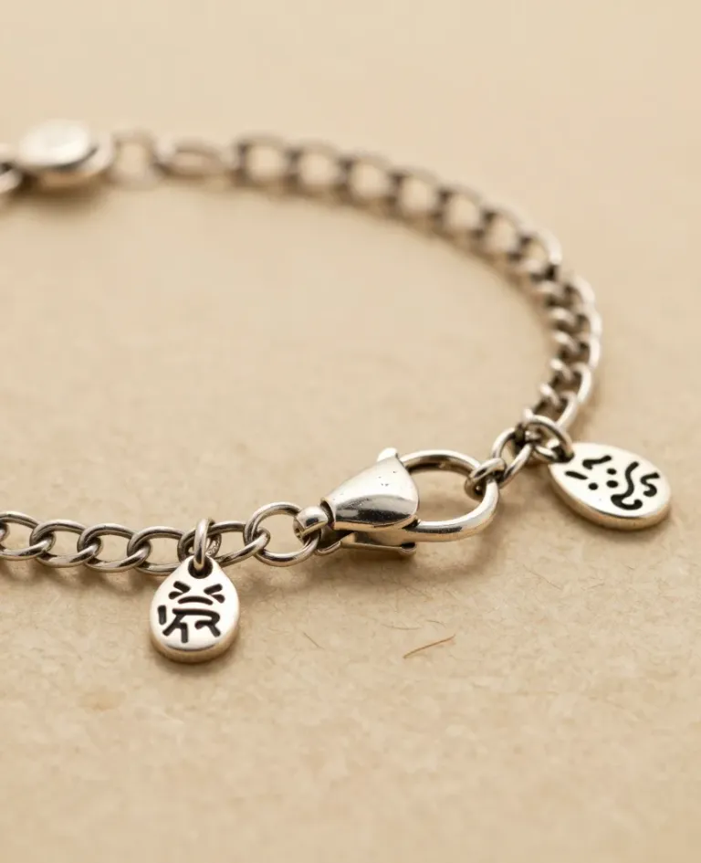 A close-up of a polished silver charm bracelet featuring a heart-shaped charm, with soft, diffused lighting that highlights the reflective surface and subtle engraving. The neutral, textured background ensures the bracelet is the focal point.