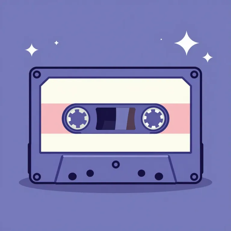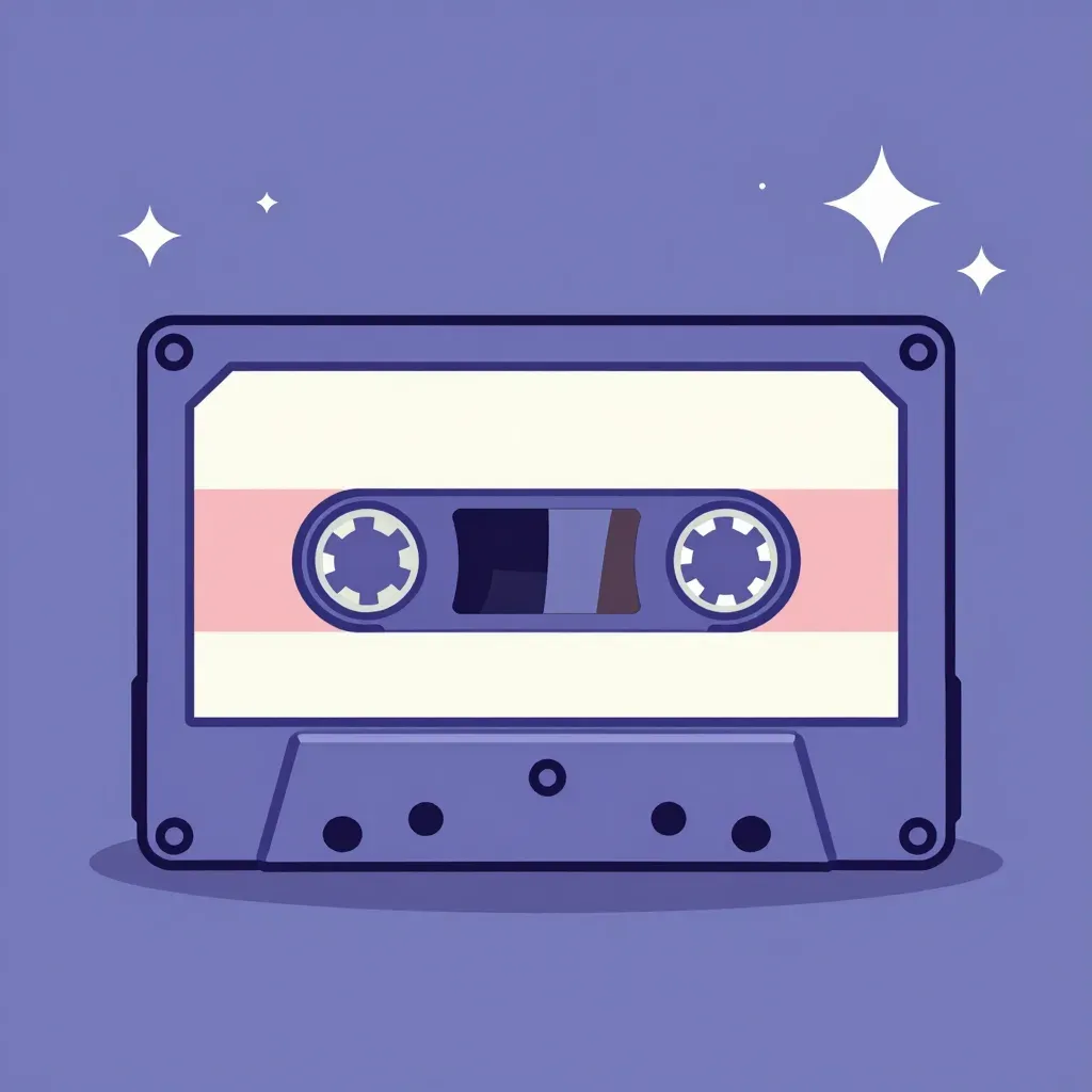 A glossy cassette tape with a pink stripe and soft velvety center, illuminated by diffused, soft lighting that creates gentle shimmer and highlights. The tape is centered with a shallow depth of field, emphasizing its texture against a slightly blurred solid purple background.