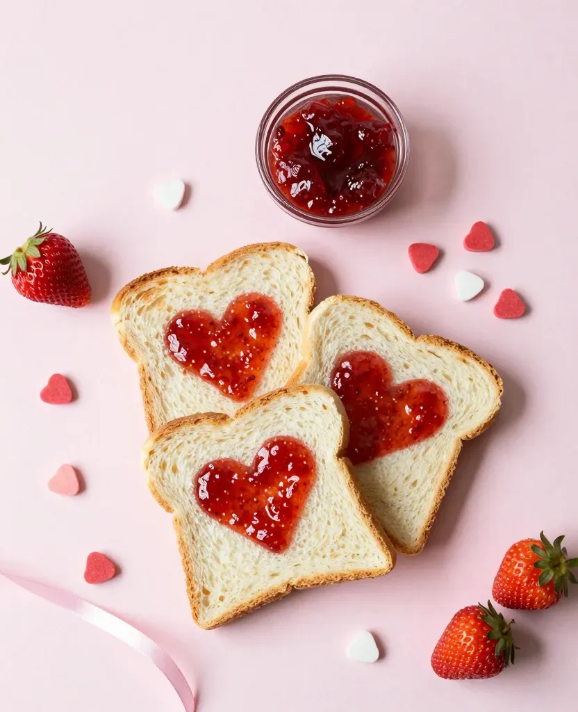 Two slices of bread with glossy red jam shaped into hearts, set against a pale pink background with soft, diffused lighting and gentle shadows. The composition is centered, with strawberries and heart decorations around the edges, creating a clean and inviting visual.