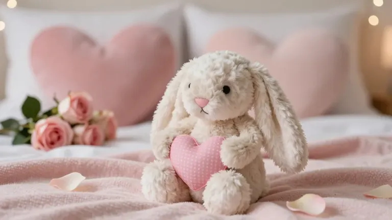 Two soft, fluffy white plush bunnies with pink cheeks sit side by side, creating a cozy Valentine's scene with scattered pink petals and blurred pink pillows in the background. The diffused, soft lighting enhances the gentle, romantic atmosphere of the image.