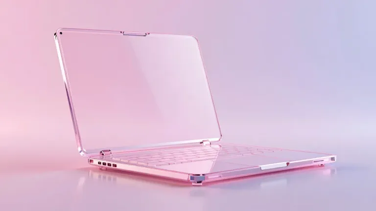 A translucent glass laptop glows softly in a pink ambient light, creating a futuristic and minimalist aesthetic. The shallow depth of field and clean background emphasize the sleek design and modern appeal of the laptop.