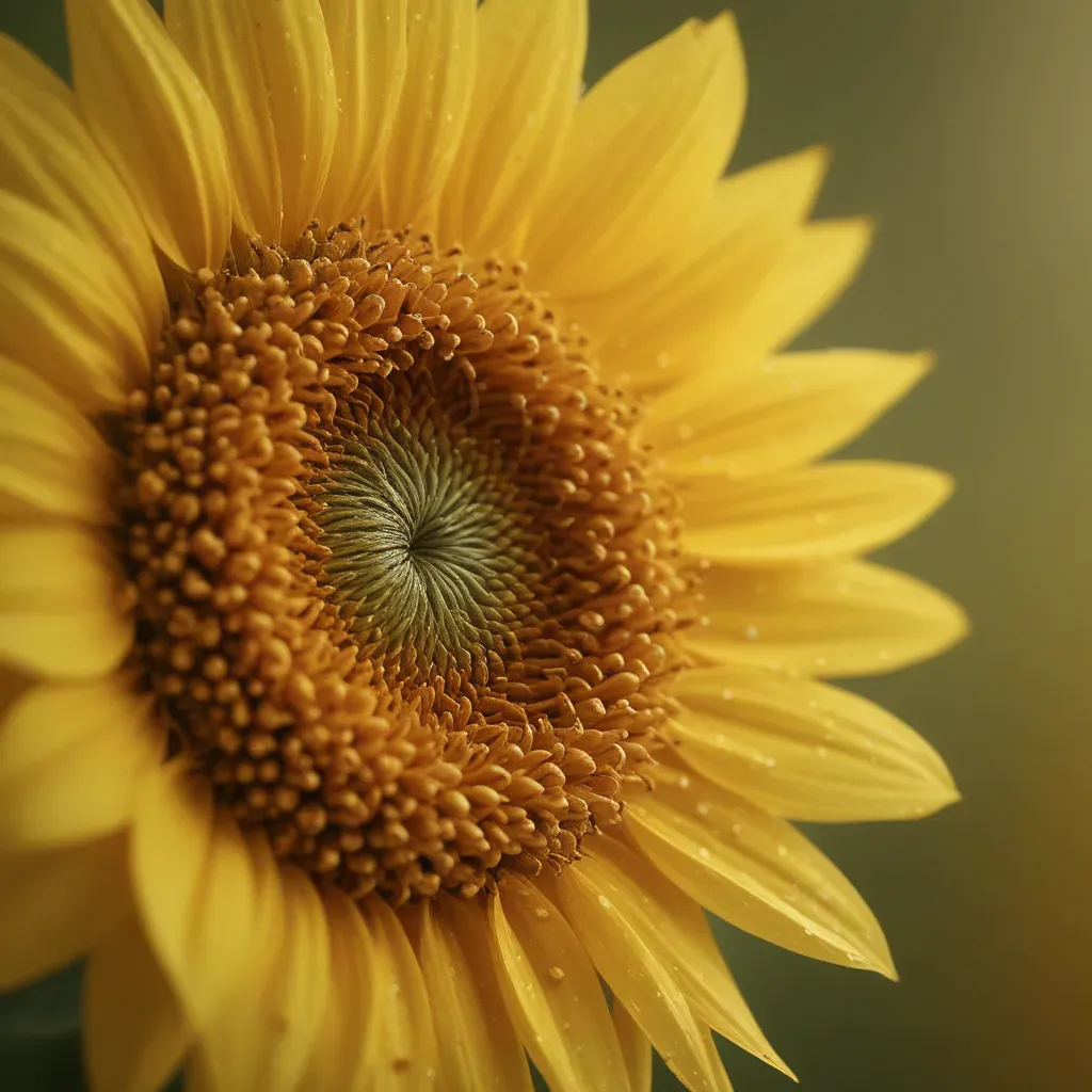 A close-up of a sunflower head, showcasing glossy, soft, slightly rough petals and dense, golden stamens under soft, diffused side lighting that creates gentle highlights and shadows, enhancing the intricate details of the flower against a blurred, out-of-focus green and yellow background.