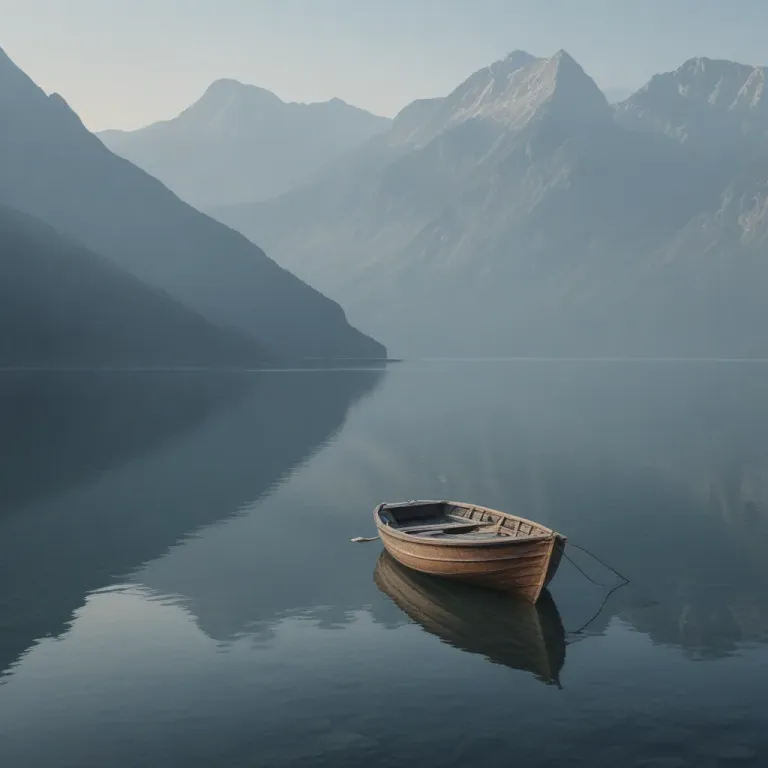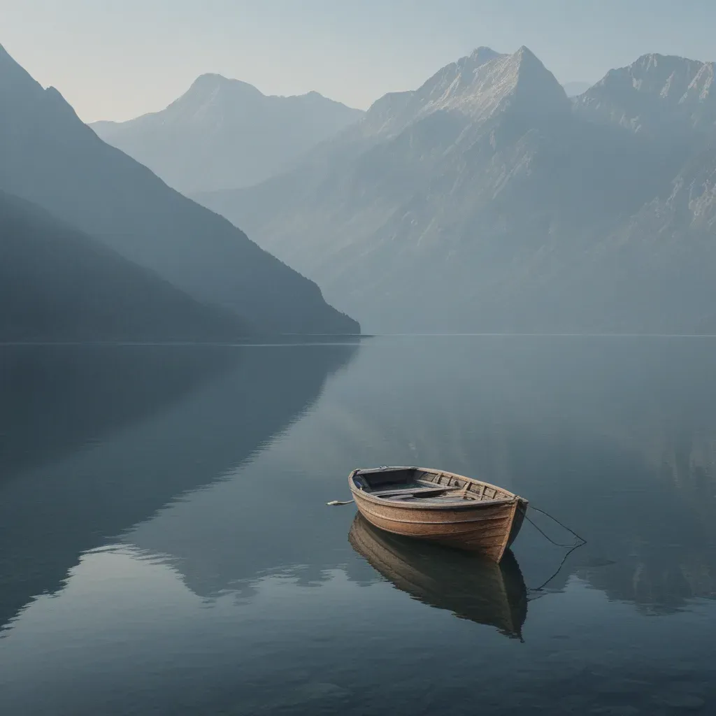A small wooden boat rests peacefully on a calm lake, its glossy surface reflecting the soft, diffused light of the surroundings. The majestic mountains in the background, partially obscured by mist, create a serene and balanced composition.