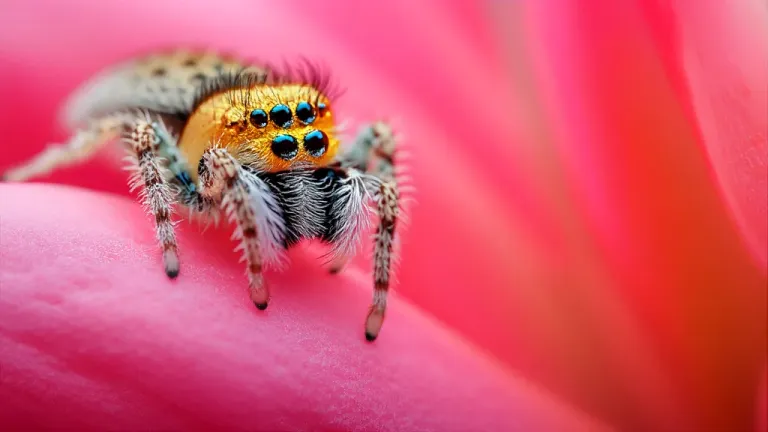 A golden and white jumping spider with glossy black eyes and fuzzy legs rests on soft, velvety pink petals, illuminated by diffused, soft lighting that highlights the spider's features and the delicate veins of the petals. The shallow depth of field blurs the vibrant pink and red background, creating a striking contrast and emphasizing the spider as the focal point.