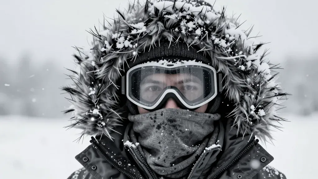 An Arctic explorer's face is partially obscured by goggles and a balaclava, with a fur hood heavily laden with snow and frost, capturing the harsh conditions of the frozen landscape. The diffused overcast lighting creates soft, even illumination with subtle highlights on the ice crystals and goggles, while the shallow depth of field blurs the snowy background, emphasizing the subject.