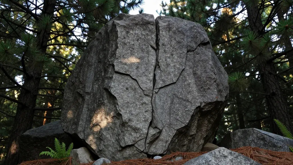A close-up of a rugged granite monolith in a forest, with sunlight filtering through pine trees, casting dappled shadows and highlights. The dense forest background, slightly blurred, emphasizes the monolith's texture and form.