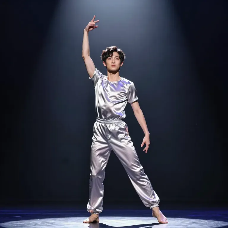 A dancer in a silver outfit gracefully poses on stage under a direct spotlight, creating high contrast and sharp shadows. The dark, blurred background isolates the subject, emphasizing the reflective silver fabric and cool tones of the scene.