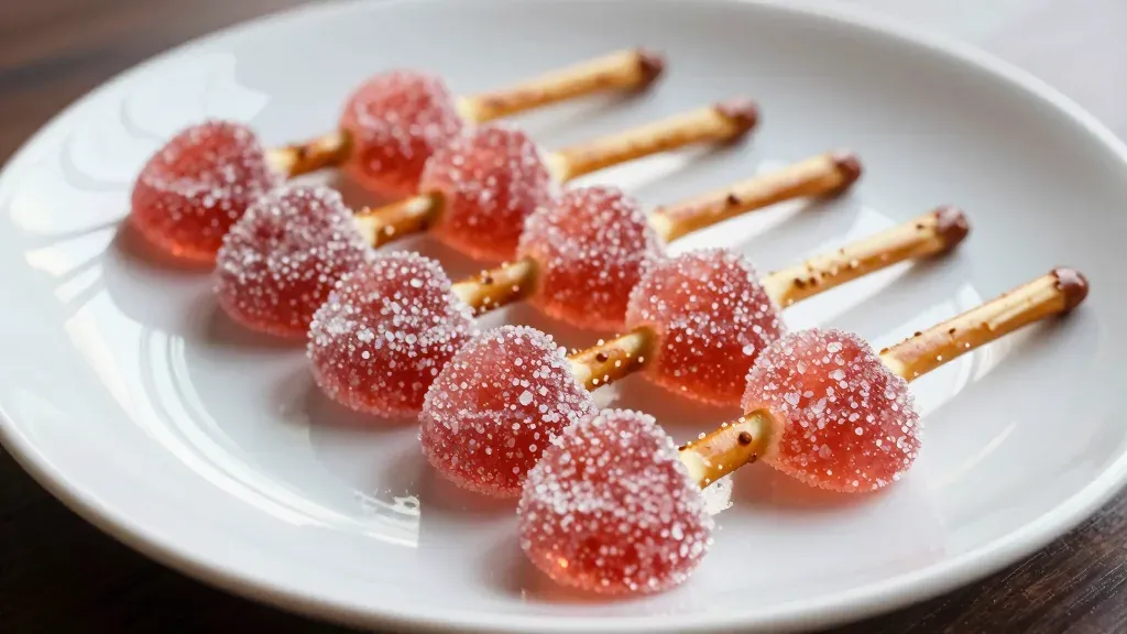 Heart-shaped candy-coated pretzel sticks arranged in a fan pattern on a white plate, their glossy translucent pink beads dusted with fine sugar crystals. Soft directional lighting from the upper left enhances texture and depth, while shallow depth of field isolates the subject against a blurred wooden background.