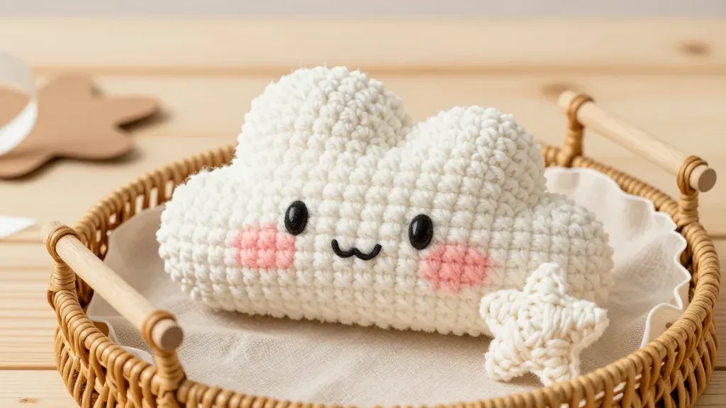 Two soft, white crocheted cloud plush toys with black and pink accents rest in a woven basket, illuminated by warm, diffused light that casts soft shadows. The background, featuring a wooden surface and crafting materials, is slightly out of focus, creating a shallow depth of field.