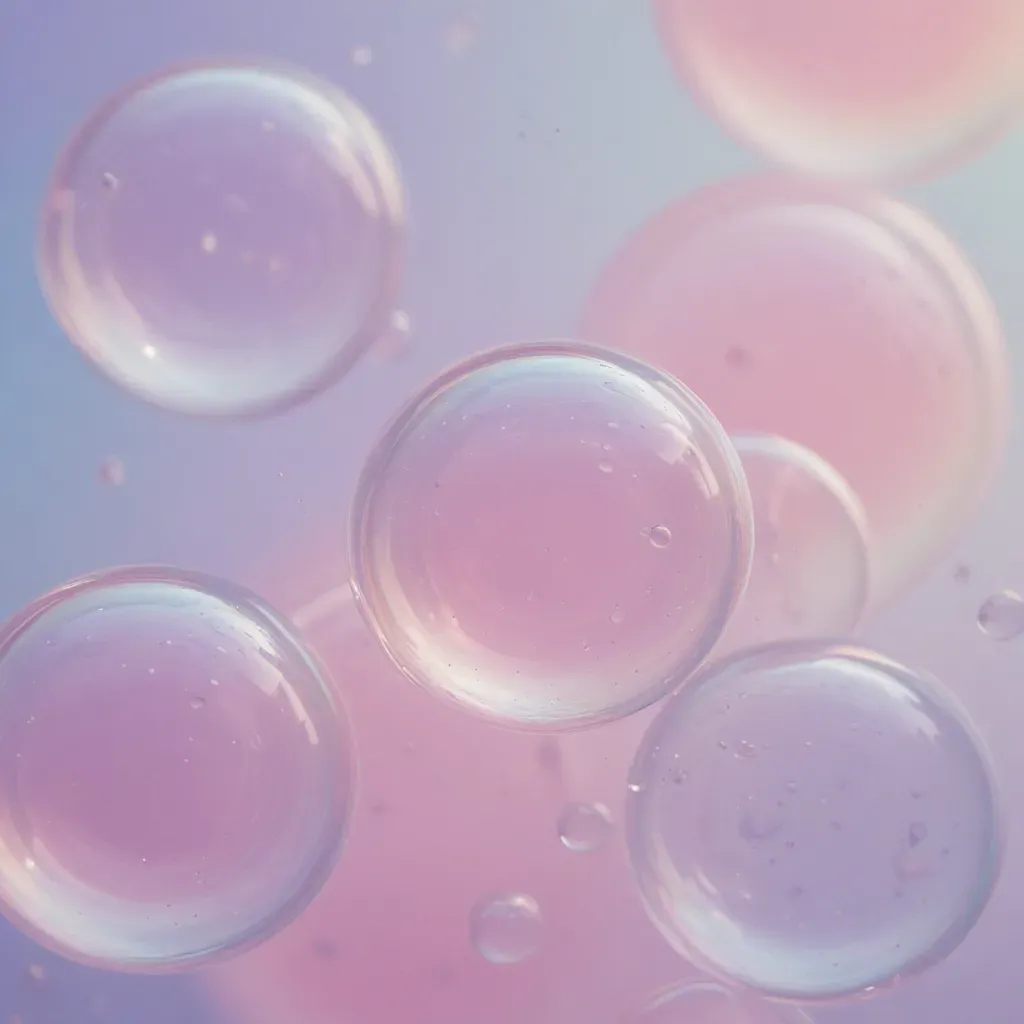 A close-up of iridescent soap bubbles with a soft, diffused light highlighting their glossy, translucent surfaces, creating a dreamy, pastel-colored background with a shallow depth of field.