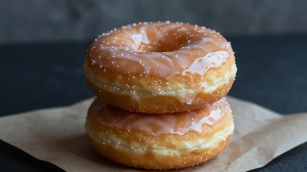 A close-up of a glazed donut ring with a sugary coating, showcasing its soft, fluffy interior and glossy glaze under soft, diffused lighting. The neutral background ensures the donut stands out, emphasizing its texture and color.