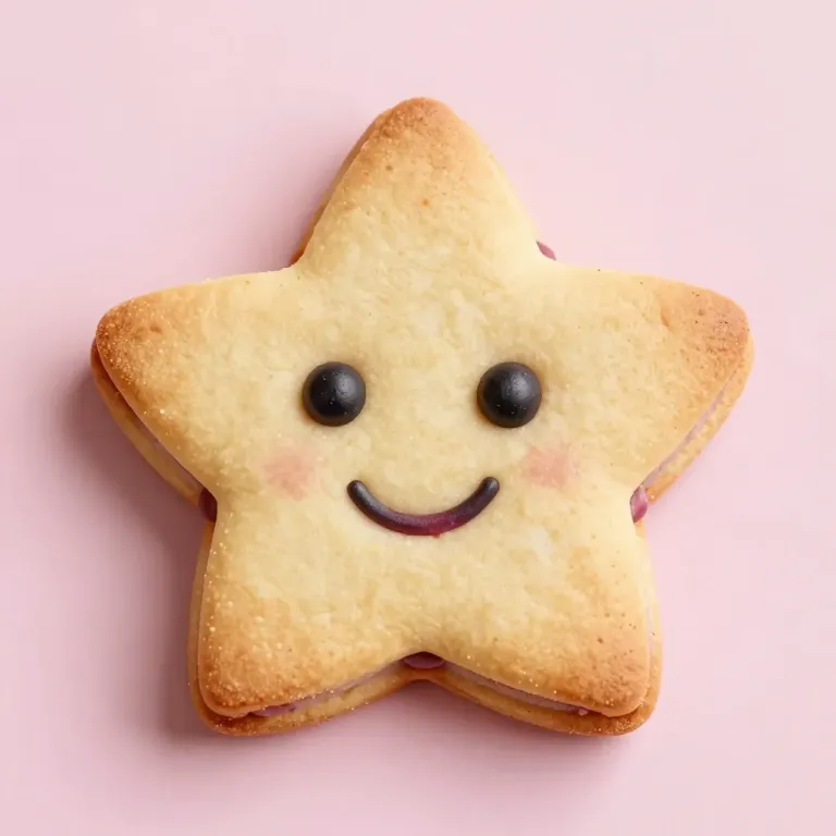 A golden-brown star-shaped cookie sandwich filled with dark red jam, featuring glossy texture and playful smile, set against a soft pink background. The warm lighting highlights the glossy surface and rich color of the jam, creating a dynamic and inviting composition.