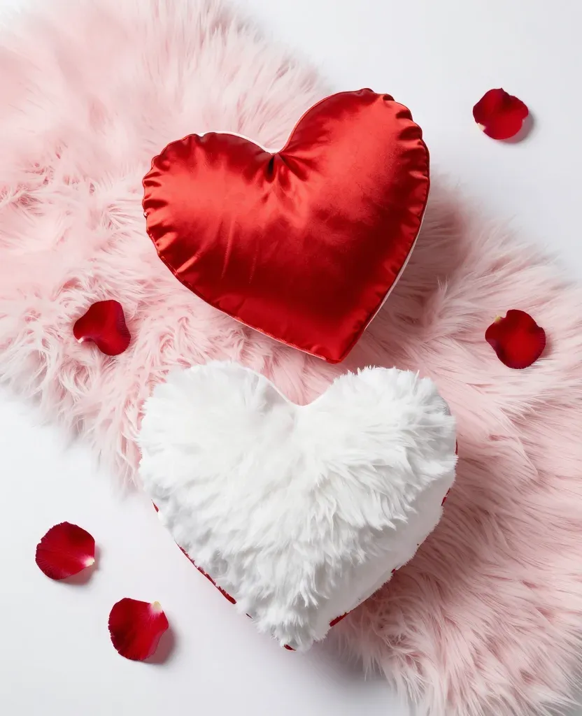 Soft, glossy red satin and fluffy white cushions with rose petals create a romantic and cozy scene. The diffused lighting highlights the textures and colors, making the image ideal for Valentine's Day or romantic decor.