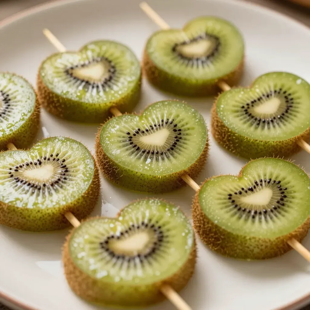 Sliced kiwi arranged in a heart shape on skewers, showcasing their glossy green skin and black seeds against a soft, diffused light. The white plate background emphasizes the vibrant colors and creates a clean, minimalistic composition.