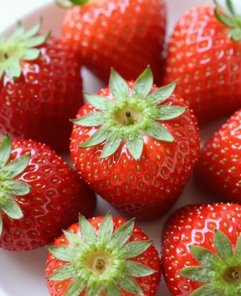 Bright red strawberries with a glossy, smooth texture and slightly bumpy seeds are highlighted by soft, diffused lighting, creating a natural sheen. The white marble background, blurred and clean, enhances the focus on the strawberries, providing ample copy space for design purposes.