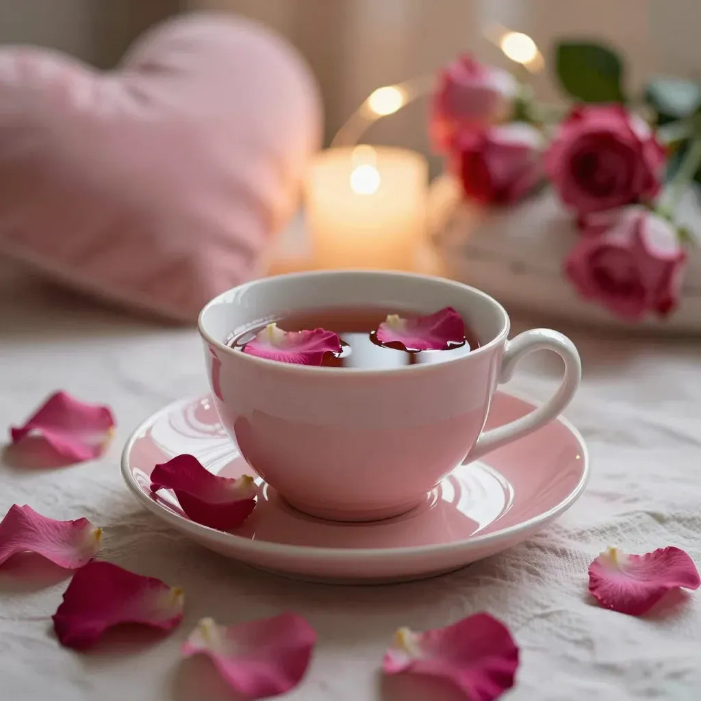 A glossy ceramic teacup filled with rose petals, bathed in warm, ambient light from a candle, creating a cozy, romantic setting. The shallow depth of field and scattered petals enhance the intimate and serene atmosphere.