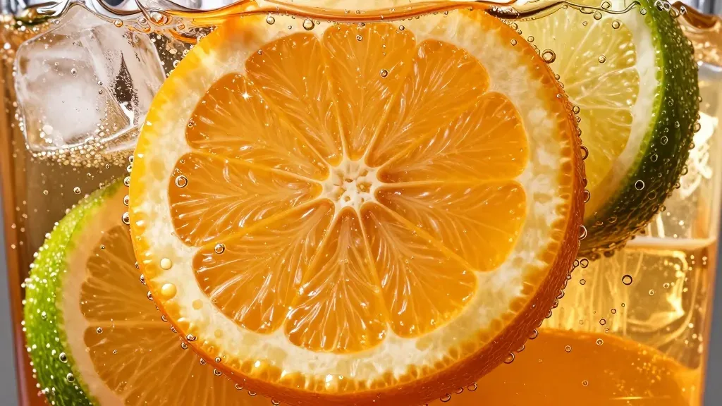 Juicy citrus slices and frothy soda bubbles create a vibrant, refreshing scene under diffused, soft lighting that highlights the textures and colors. The shallow depth of field blurs the background, focusing attention on the citrus and soda in the foreground.