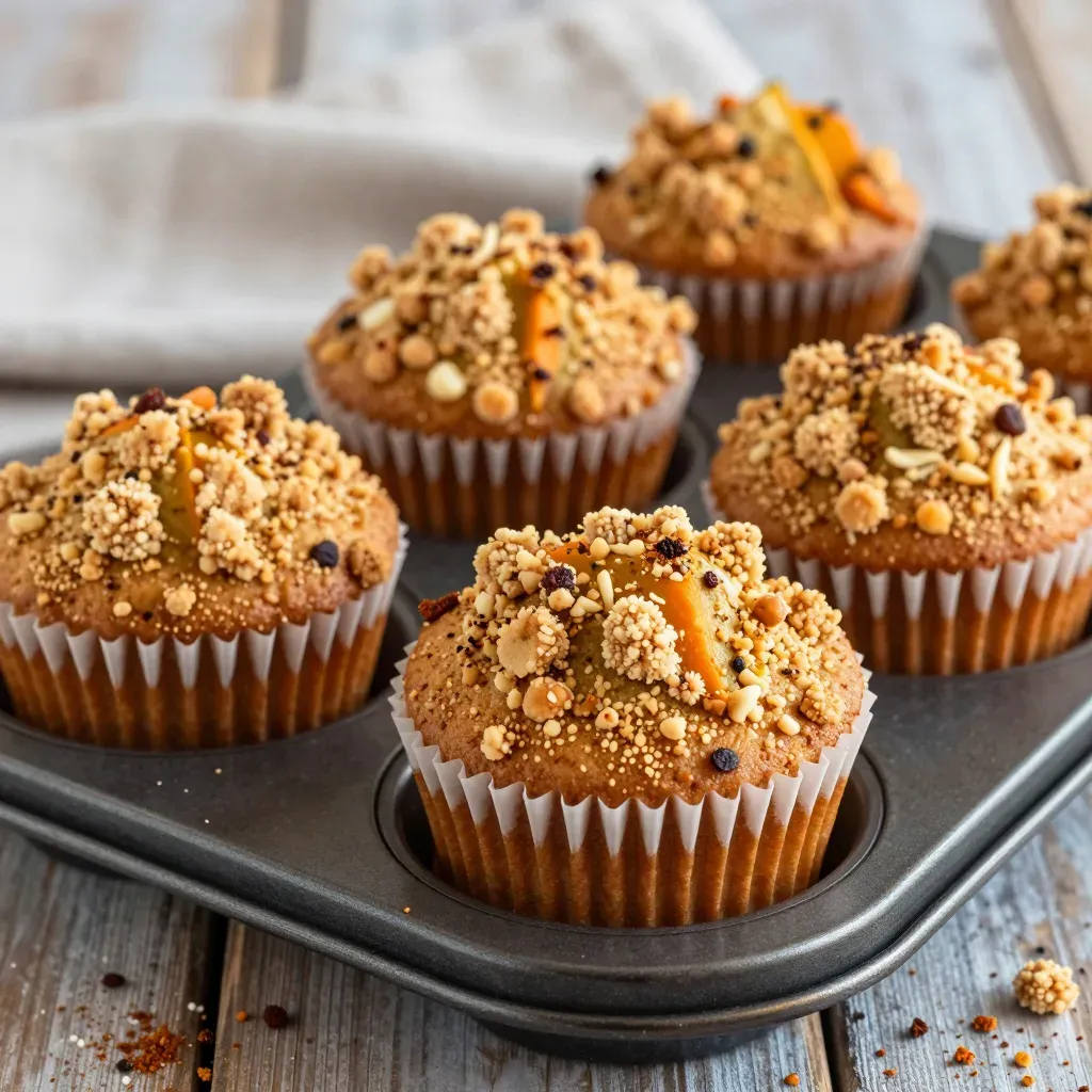 Golden-brown pumpkin spice muffins with a rough streusel topping, bathed in warm, soft light that highlights their texture and rich colors. The close-up shot and shallow depth of field create a focused, inviting presentation ideal for culinary or food advertising.