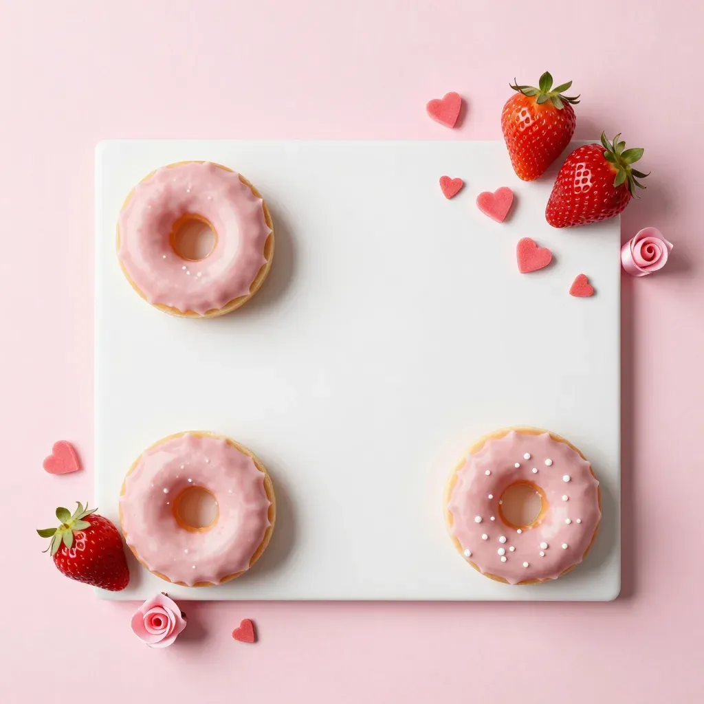 A glossy pink donut with delicate decorations sits on a white board, surrounded by soft strawberries and heart-shaped accents, all under diffused, soft lighting that highlights the textures and glaze. The clean, solid pink background enhances the vibrant colors and creates a visually appealing, balanced composition.