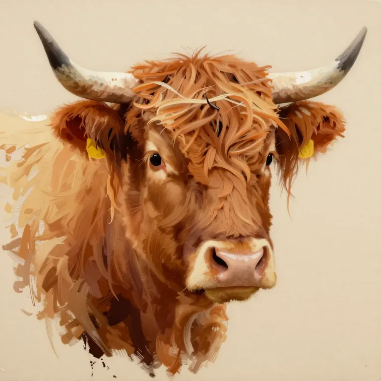A Highland calf with soft, fluffy fur and glossy horns gazes directly at the viewer, illuminated by soft, diffused light that highlights the texture and sheen of its fur. The neutral beige background is slightly blurred, emphasizing the calf's face and creating a shallow depth of field.