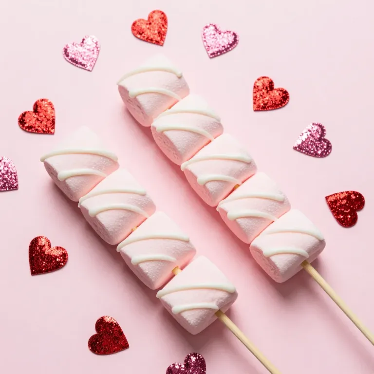 Three marshmallow skewers with glossy white chocolate drizzle are arranged diagonally on a soft pink surface, surrounded by glittery red and rose gold heart confetti. The soft, diffused lighting creates subtle highlights on the chocolate and confetti, while the shallow depth of field emphasizes the foreground skewers against a clean, uncluttered background.