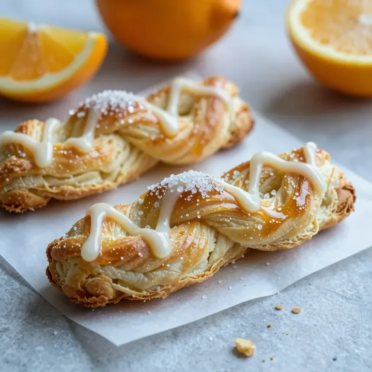 Golden-brown citrus-glazed twists with coarse salt are highlighted by soft, diffused lighting, emphasizing their glossy glaze and flaky texture. The shallow depth of field and centered composition create a clean, focused presentation ideal for culinary and food photography.