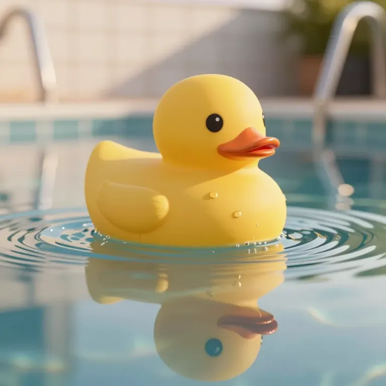 A glossy yellow rubber duck floats serenely on the surface of a swimming pool, illuminated by warm, golden sunlight that creates shimmering highlights on the water's surface and the duck's smooth, reflective surface. The shallow depth of field isolates the duck, emphasizing its vibrant color and glossy texture against the blurred, tiled edges of the pool.