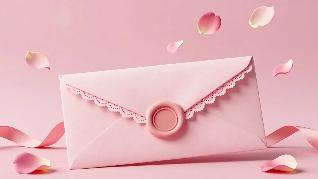 A glossy lace-edged envelope is the focal point, surrounded by soft, velvety rose petals, creating a romantic and delicate atmosphere. The soft, diffused lighting enhances the gentle glow, adding depth and movement to the composition.