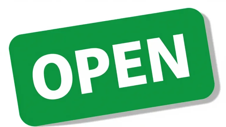 A smooth, glossy green 'OPEN' sign with white text, softly lit from above, creating subtle shadows and emphasizing the sign against a plain white background. The centered, slightly tilted composition adds a dynamic feel, ideal for signage or business-related content.