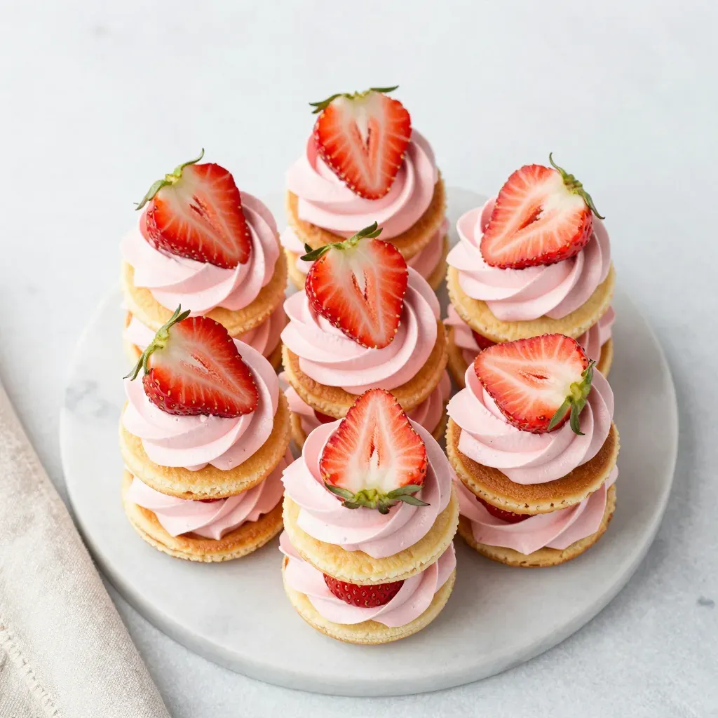 Soft pink frosting and glossy strawberry slices adorn these delicate mini strawberry shortcake cakes, arranged in a centered, slightly elevated view that highlights their layers and textures. The diffused, soft light from above creates gentle shadows, enhancing the clean, light marble background that keeps the focus on the cakes.