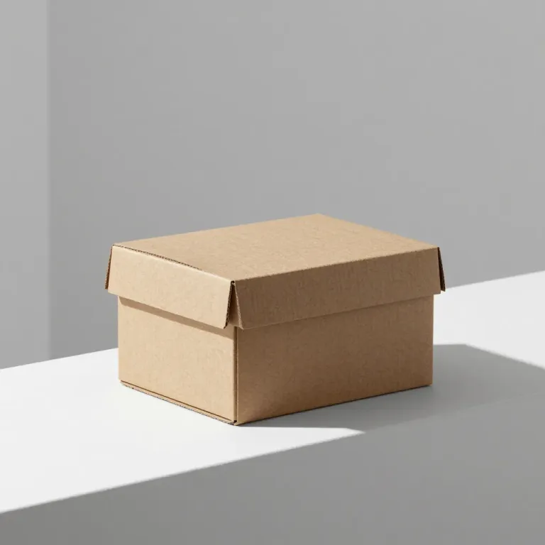 A rough, corrugated cardboard box with a hinged lid sits centered on a plain white surface, bathed in soft, diffused light from above, casting sharp shadows. The minimalist composition and high contrast make it ideal for product photography and packaging design.